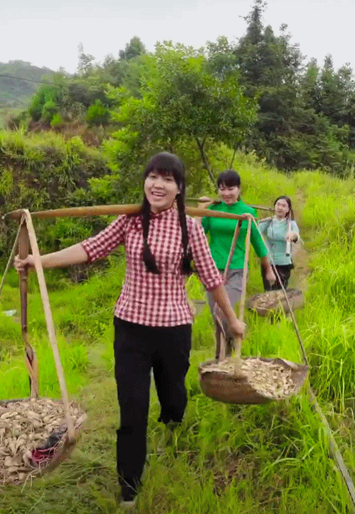 她可以輕松地在齊膝的泥水里趕牛耕田,一個人能輕松地拎起一整只小豬仔,或者兩筐谷子,絲毫不遜于男人,干著農活還不忘搞怪,讓人敬佩的同時還有點反差萌。